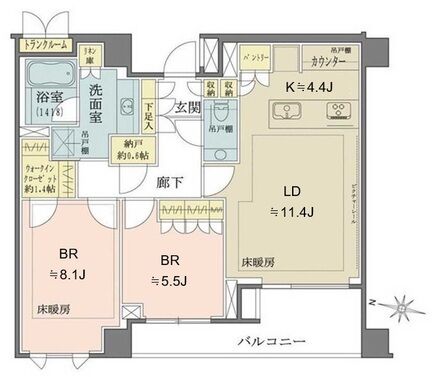 | 特徴 | 食器洗浄乾燥機、インターネット、エアコン、床暖房、オートロック、警備システム、トランクルーム、宅配BOX、バルコニー、楽器相談、ペット不可、駐輪場 |