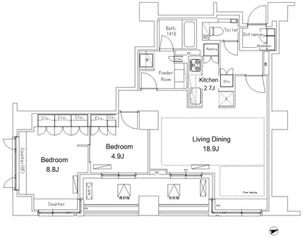 特徴 フローリング、床暖房、ペット相談、駐車場、洗濯機、エアコン、BS端子、CATV、CS、インターネット、オートロック、宅配BOX、バイク置き場、バルコニー、楽器相談、小型ペットのみ可