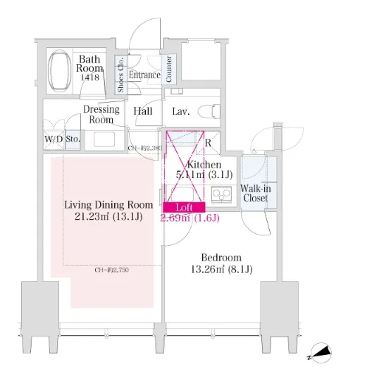 | 1304 | 1 Bedroom | 52.98m² | Rent | 369,000yen | 2months | None | 13th floor | |