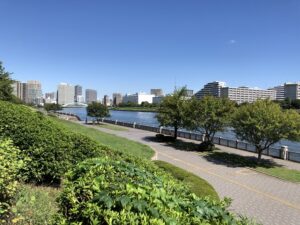 Ishikawajima Koen (Park)  A waterfront park with open green space along the Sumida River. It is right next to River City 21 and a great spot for jogging or taking a walk with a dog.